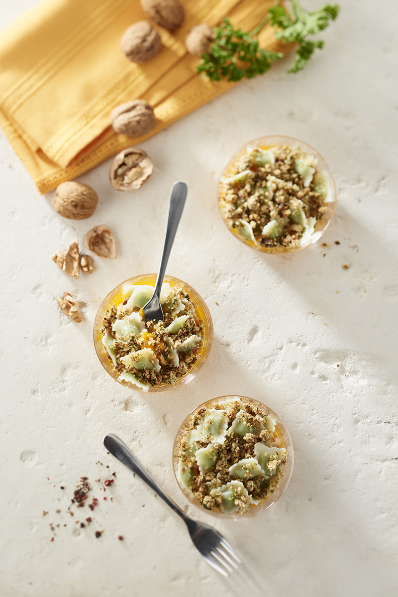 Verrines de ravioles et courge, pesto de persil