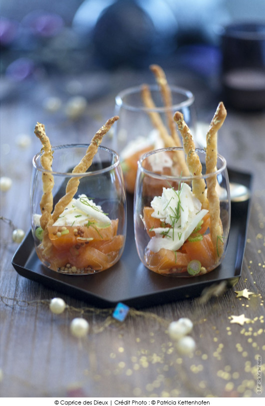 Verrines de saumon mariné et pétales de Caprice des Dieux