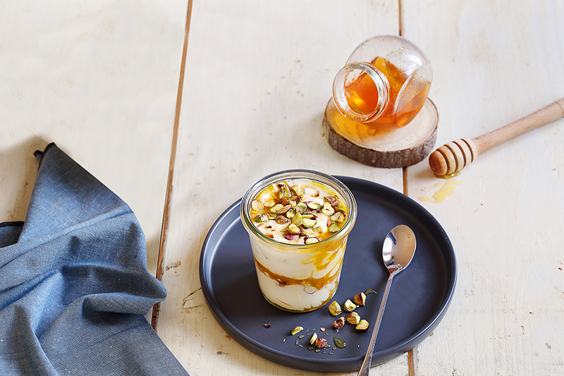 Verrines de yaourt au chèvre, pistaches et miel