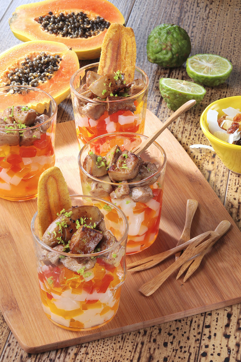 Une entrée festive alliant la douceur des fruits exotiques à la richesse du Foie Gras poêlé, relevée par le croustillant des chips de banane.