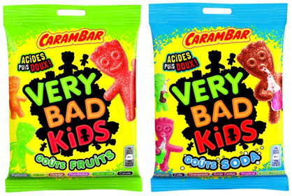 Derniers nés de la marque Carambar, ces sales gosses au cœur tendre vont faire parler d’eux. Découvrez les nouveaux bonbons gélifiés VERY BAD KIDS à la forme malicieuse et aux couleurs flashy qui vont vous surprendre par leur effet méchamment acide puis tout doux !