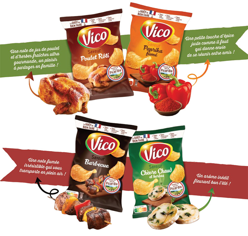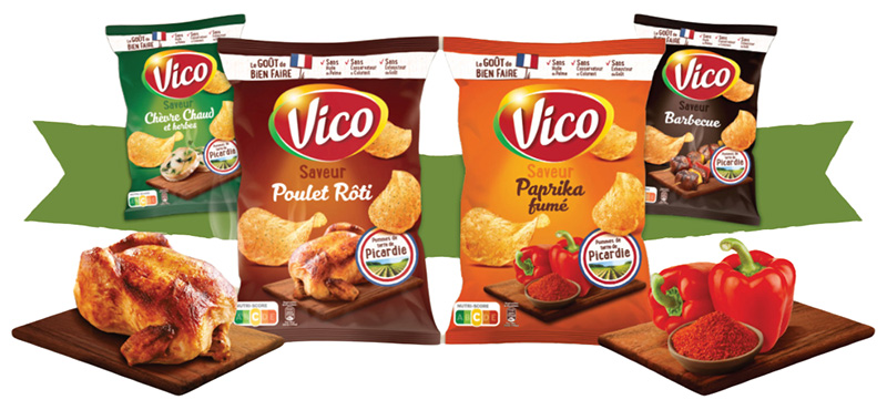 Avec des saveurs vraiment plus intenses, les chips lisses aromatisées Vico vous transportent vers des moments de dégustation évocateurs de déjeuners en famille sous le soleil, de réunions entre amis dans le jardin, de vacances en pleine nature… Un voyage des sens destination plaisir grâce à des chips toujours plus savoureuses, avec des recettes toujours aussi simples : sans exhausteur de goût, sans huile de palme, colorant ou autre conservateur. Vico peut valoriser une origine 100% picarde et une fabrication française à Vic-sur-Aisne, avec une gamme répondant à toutes les envies d’une tradition gourmande tricolore.