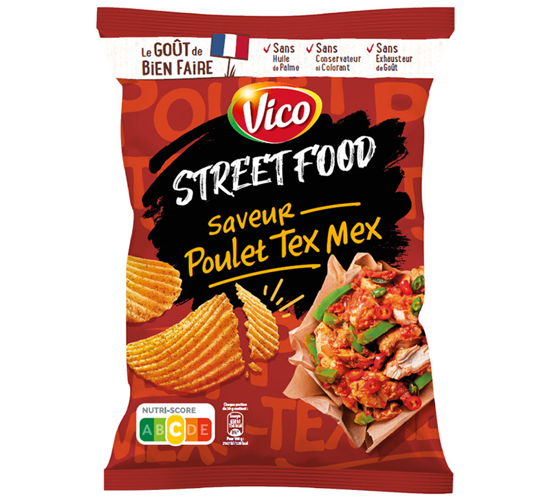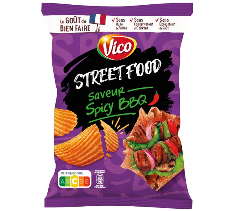 Fidèle à son GOÛT DE BIEN FAIRE, Vico s’appuie sur la gourmandise de chips ondulées ULTRA CRAQUANTES, concoctées avec des pommes de terre de Picardie, et une recette sans huile de palme, sans exhausteur de goût, sans conservateur ni colorant ! La marque a également développé, en avant-première pour cette GAMME, un EMBALLAGE UTILISANT 29% D’ENCRE EN MOINS que sur ses autres packagings*. Avec ses ARÔMES INÉDITS, « VICO STREET FOOD » offre une expérience authentique pour de VRAIS AVENTURIERS DU GOÛT !
