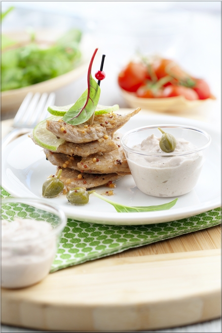 4• Réunir 4 ou 5 morceaux de veau à l’aide d’un pic en bois et présenter dans une assiette avec la sauce au thon dans un petit pot ou alors nappée.
