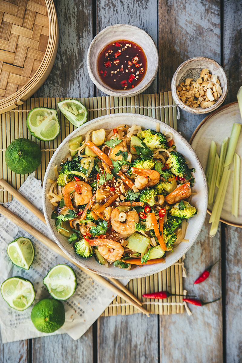 ②• Portez un grand volume d’eau à ébullition et faites cuire les nouilles de riz le temps indiqué sur l’emballage. Égouttez et réservez.