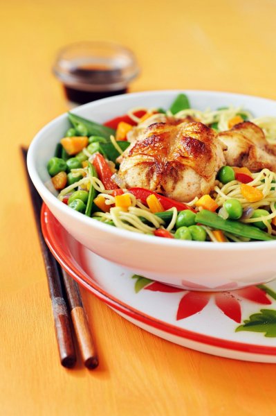 Ajoutez alors les nouilles chinoises, les râbles de lapin, les petits pois et les pois gourmands. Versez la sauce soja, salez, poivrez à votre goût, faites revenir le tout 10 minutes et servez immédiatement.
