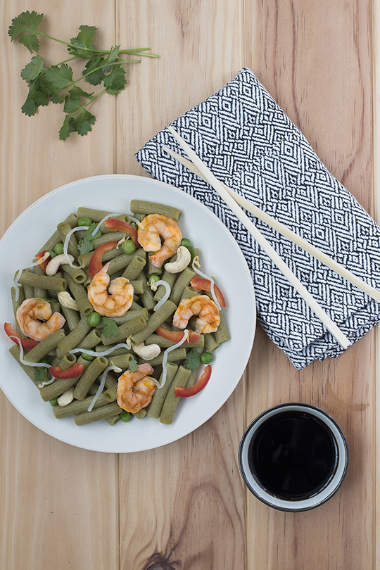 Wok de rigatoni, crevettes et légumes