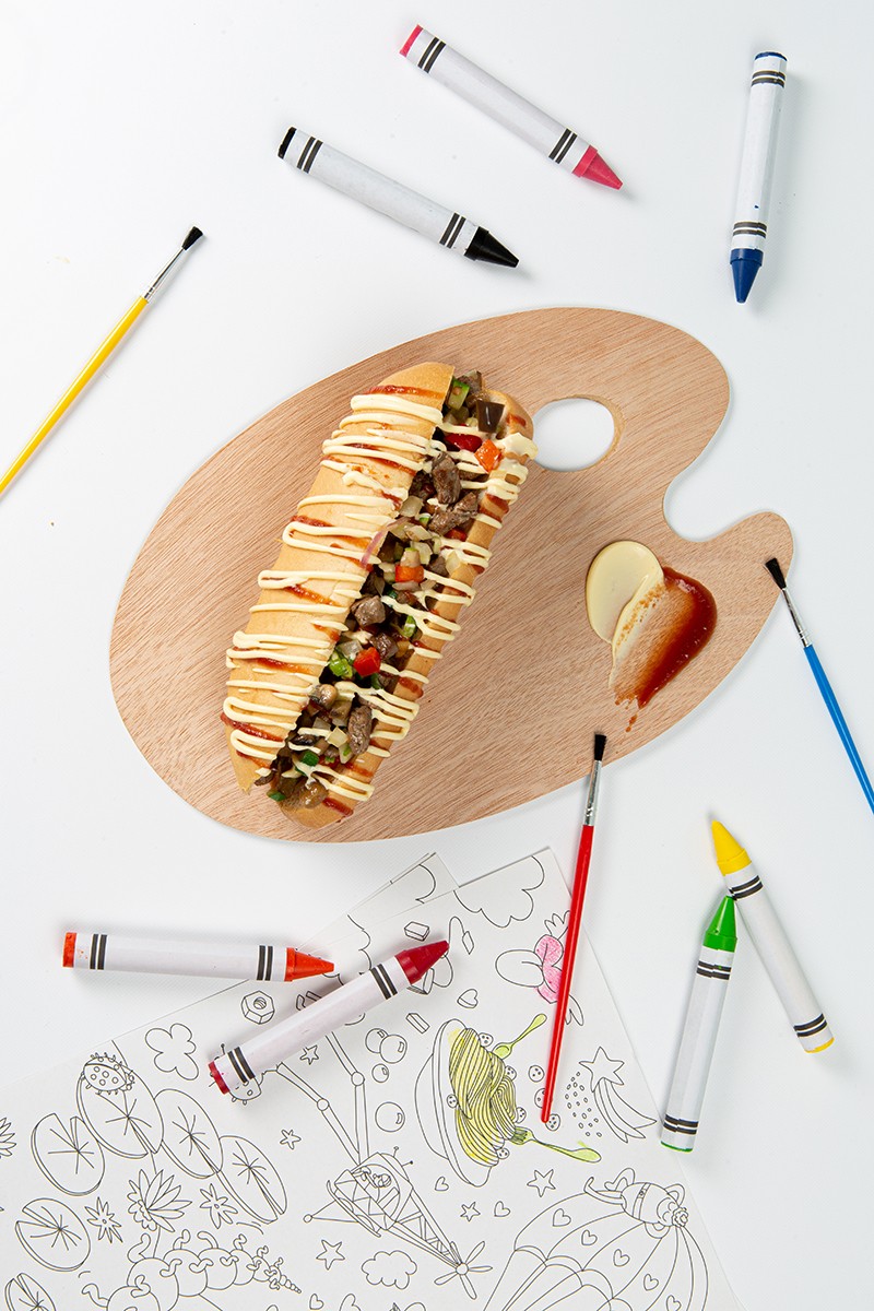 Dans un pain à hot-dog, mettre le contenu du wok de bœuf, puis faire un zig-zag de sauce avec le ketchup et la mayonnaise par-dessus.