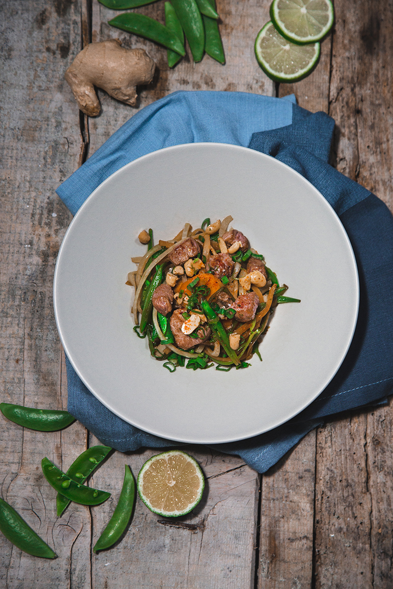 Mettre le contenu du wok dans une assiette. Ajouter les cacahuètes.