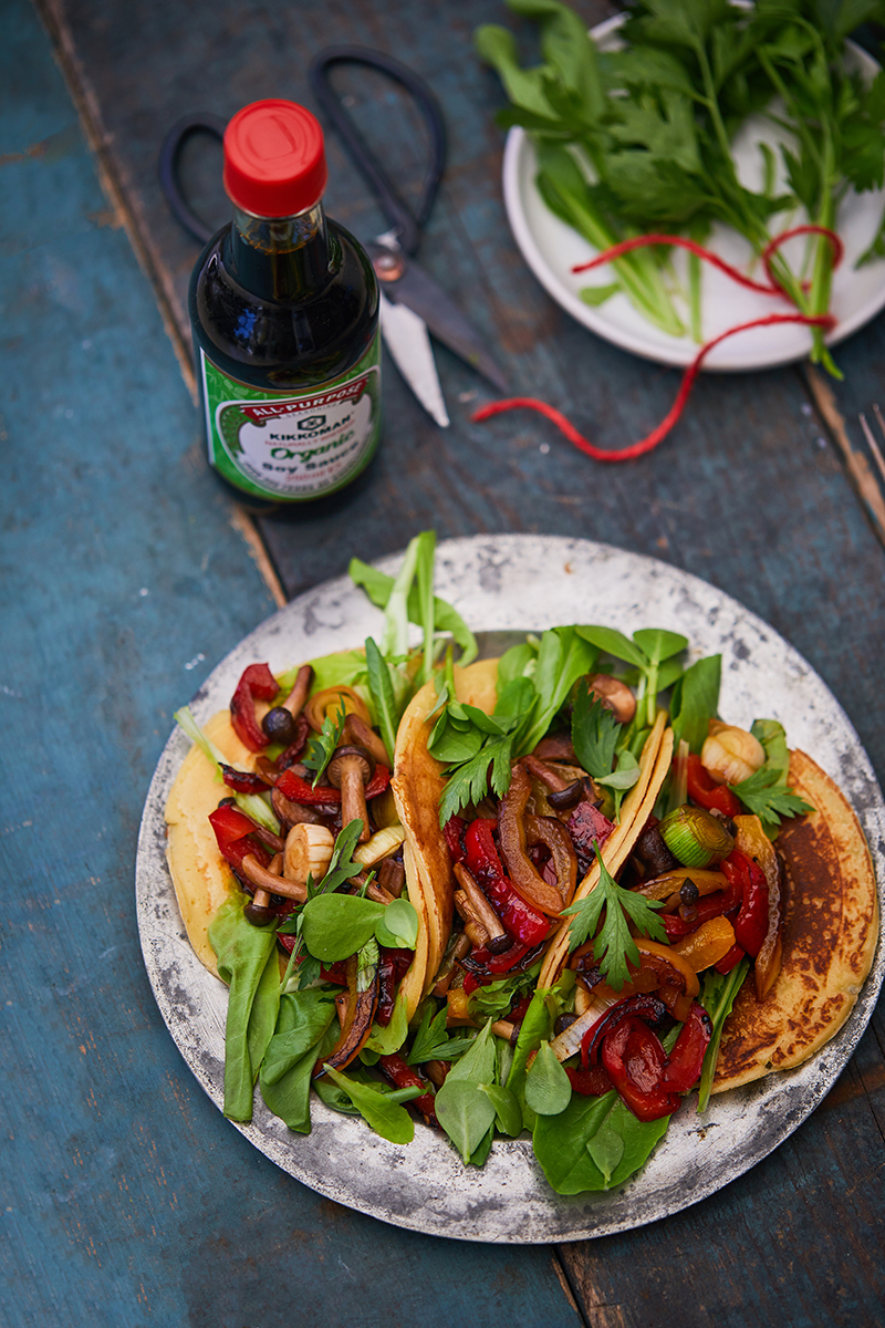 ①• Mélanger les œufs, la farine et le lait jusqu’à obtention d’une pâte à crêpes, on peut relever la pâte avec de la sauce soja bio naturellement fermentée Kikkoman. Faire cuire les wraps de la même manière que des crêpes et les réserver.
