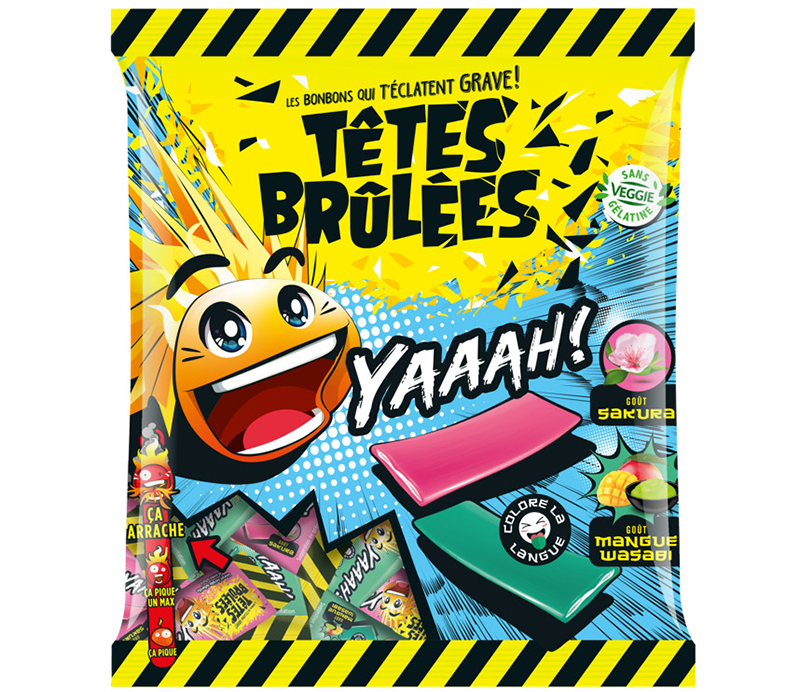 Les Têtes Brûlées mettent le cap sur le pays du soleil levant pour lancer des bonbons inédits, dénommés « YAAAH! ». Proposés sous forme de barres, ils atteignent le plus haut niveau d’intensité des Têtes Brûlées : « ça arrache ». Ils se déclinent en deux saveurs : l’une très typée pour des sensations incroyables : « mangue-wasabi » et l’autre plus douce, évoquant les cerisiers du printemps : « Sakura ».