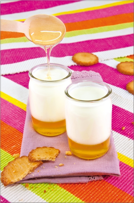 2• Déposez 1 cuillère à soupe de miel au fond de chaque pot et versez par-dessus la préparation lactée.