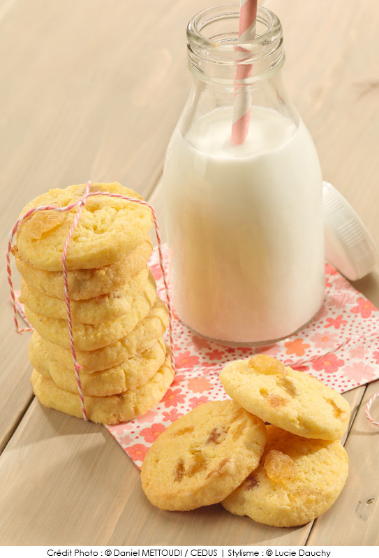 ①• Dans un saladier, réunir les 2 sortes de farine. Ajouter les zestes de citron hachés finement, une pincée de sel et la levure. Dans un bol, fouetter l’œuf avec le sucre en poudre. Verser dans le saladier. Incorporer le beurre coupé en dés et les raisins blonds, mélanger jusqu’à obtention d’une pâte homogène.